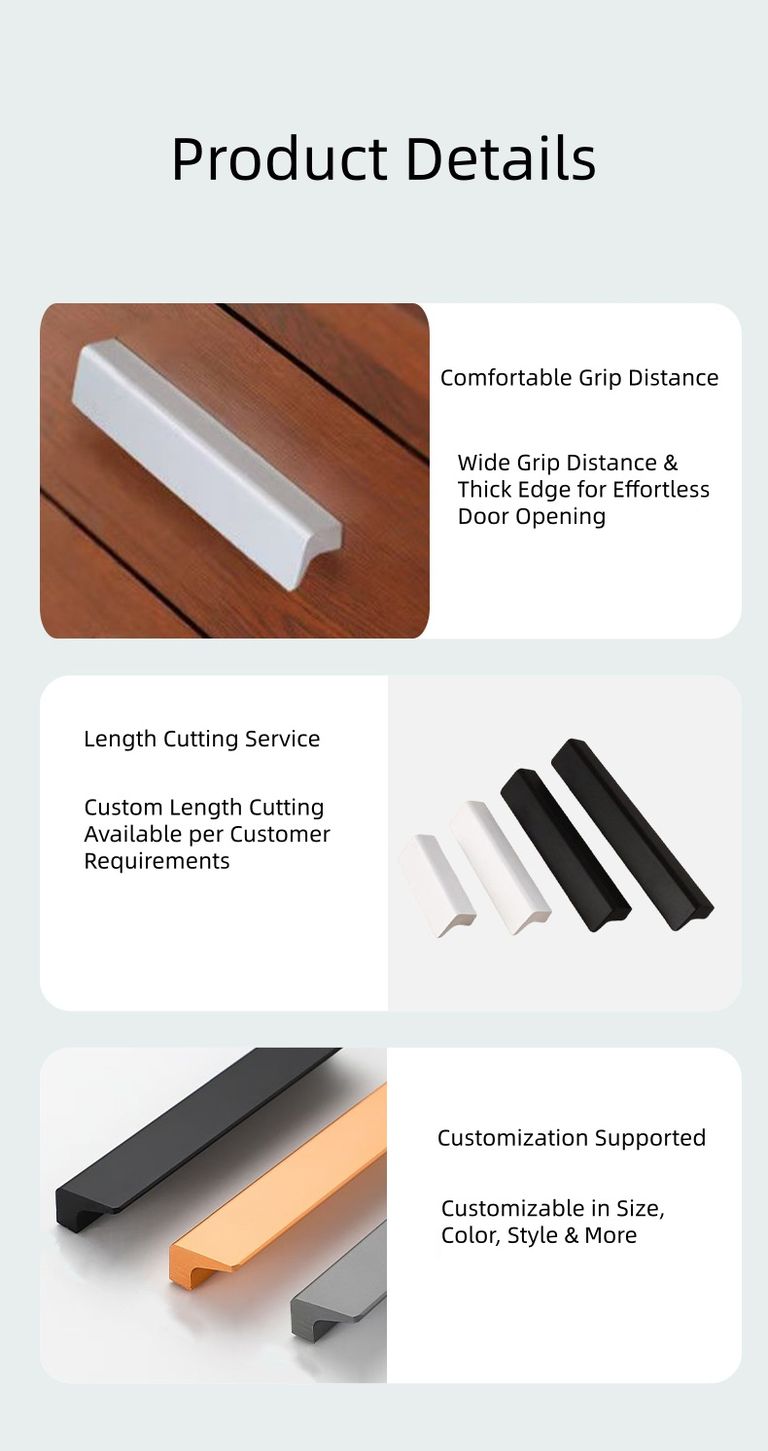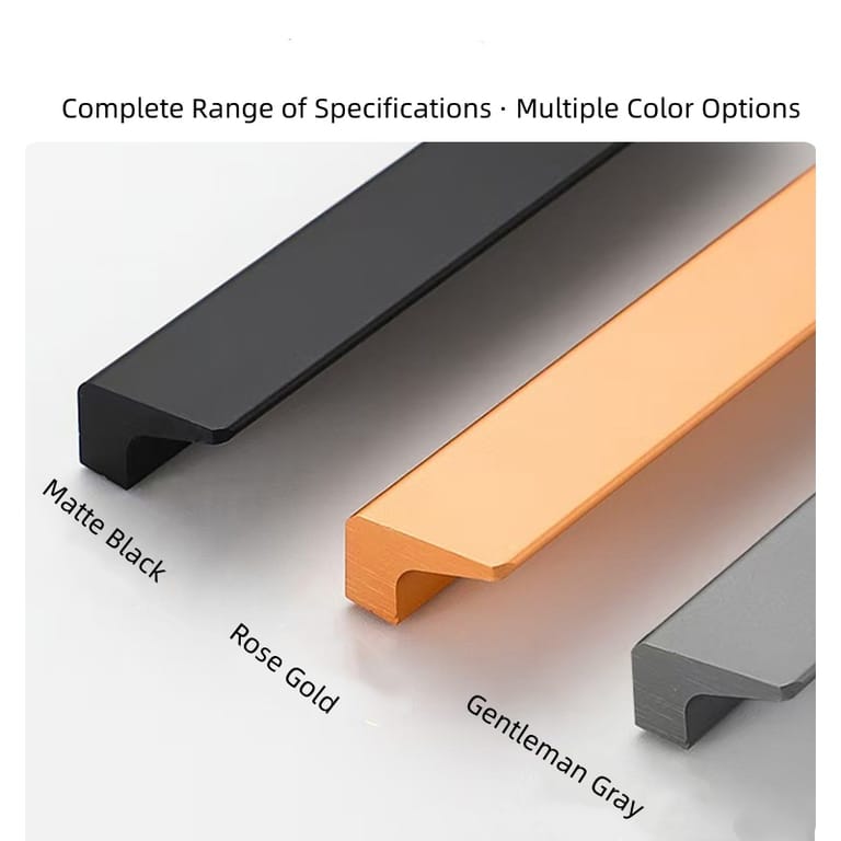 Modern minimalist cabinet pulls made of rust-proof aluminum alloy; safe rounded edges, scratch-resistant oxidation process, multiple sizes for cabinets/wardrobes; ideal for home & furniture projects.