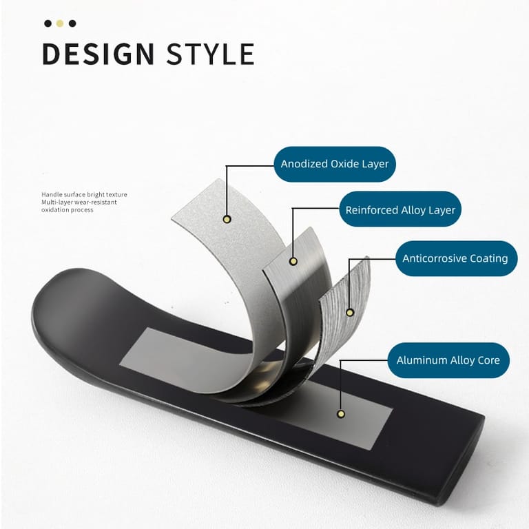 This curved cabinet handle is crafted from high-quality pure aluminum alloy as the main raw material, with a four-layer composite structure: aluminum alloy inner core + high-strength reinforcement layer + anti-corrosion isolation layer + surface electroplating finish layer. The standard physical size is 115mm in total length, 28.1mm in width and 8.1mm in thickness, with lightweight solid structure that adds no extra burden to furniture panels. It is available in two classic colors: matte black and brushed gold, with smooth burr-free surface after fine polishing. Core performance includes rust resistance, scratch resistance, deformation resistance and fade resistance; it has universal compatibility and fits most standard furniture door panels and drawer surfaces.