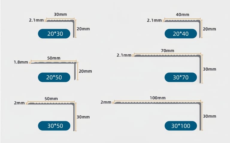 This stair anti-slip nosing is made of 6063-T5 aluminum alloy (aerospace-grade material) with anodized surface treatment. It comes in 6 size options: 20*30mm, 20*40mm, 20*50mm, 30*50mm, 30*70mm, 30*100mm (thickness ranges 1.8mm-2.1mm). Available colors include matte black, matte silver, gold, iron gray, and purple gold. Its core performance features anti-slip, anti-corrosion, waterproof, and impact resistance. It’s suitable for stairs, tiles, thresholds, and door sills.