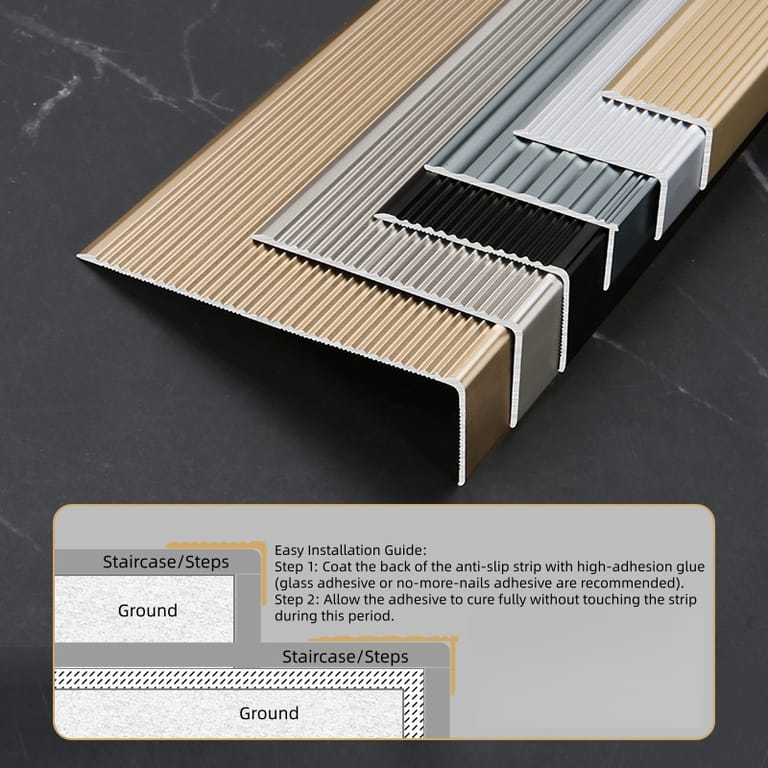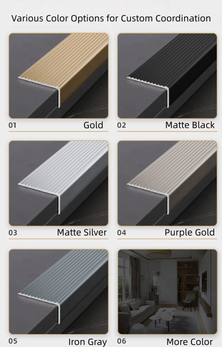 Premium 6063-T5 aluminum stair anti-slip nosing: anti-corrosion, non-slip, waterproof. Custom sizes/colors for stairs, tiles, thresholds. 20+ years durability. Safe for home & commercial use.