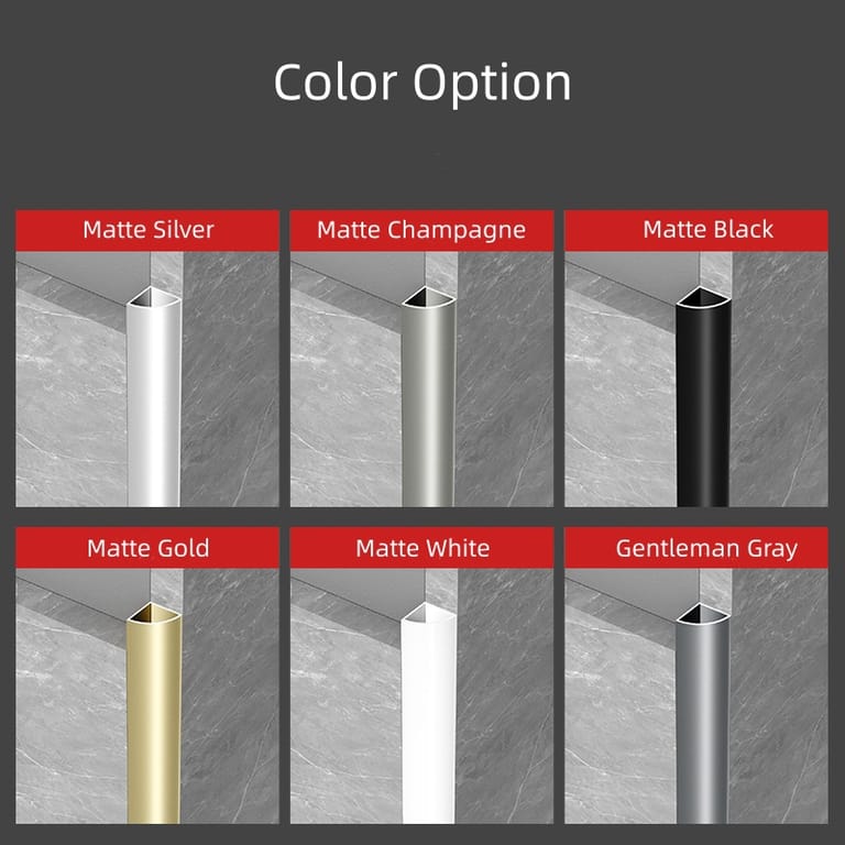 This tile trim is made of 6063-T5 Aluminum Alloy, with surface processes including anodization and fluorocarbon spraying. It has a standard length of 2.5m, with available sizes (in mm) of 6, 10, 15, 20, and 30. Color options include Matte Silver, Matte Black, Matte Champagne, Matte Orange Gold, Matte White, and Gentleman Gray. It’s lightweight yet sturdy, with waterproof, anti-scratch, and anti-fingerprint performance.