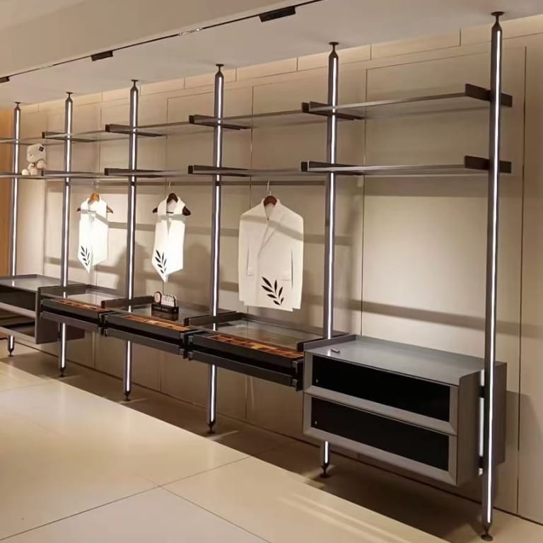 Boutique display scenario: Clothing retailers can use the L-shaped wardrobe to display high-end clothing such as dresses and suits; the matte alloy frame and glass shelves highlight the texture of the clothes, attracting customers' attention and improving the grade of the store.