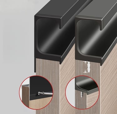 Aluminum Grooved Handles: True to their name, these need a precise groove cut into cabinet doors/drawers. Crafted from sturdy aluminum, they require routing tools or professional help to fit flush, making them ideal for full renovations but not quick updates.