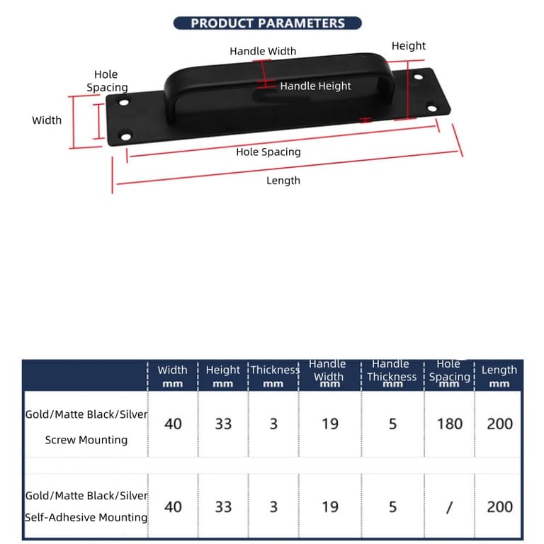 This Sliding Door Pull Handle is made of premium aluminum alloy, available in Gold, Matte Black, Silver, and Space Gray. It measures 200mm in total length (180mm hole distance for drill-mount models), 40mm wide, 33mm high, and 3mm thick; the handle grip is 19mm wide. Each handle weighs 35g (substantial yet lightweight) and fits 16-25mm thick furniture boards—ideal for sliding doors, wardrobes, cabinets, and switch cabinets. It’s deformation-resistant, waterproof, and rustproof for long-term reliability.