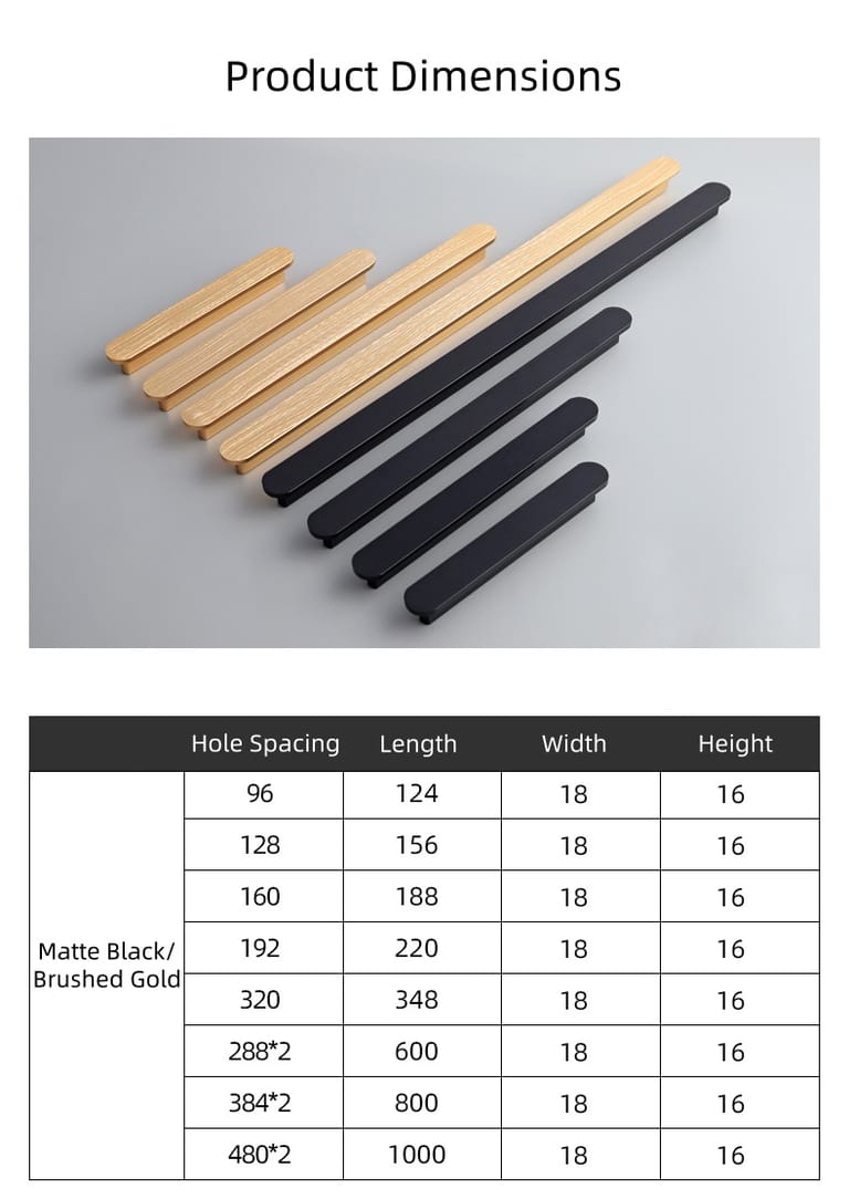 This handle is made of eco-friendly space aluminum. It comes in two colors: matte black and brushed gold. Sizing options include 8 hole spacing variants (96mm, 128mm, 160mm, 192mm, 320mm, 2882mm, 3842mm, 480*2mm), with corresponding total lengths ranging from 124mm to 1000mm. All handles share a 18mm width and 16mm height. It’s compatible with kitchen cabinets, bathroom vanities, wardrobe doors, and drawer fronts.