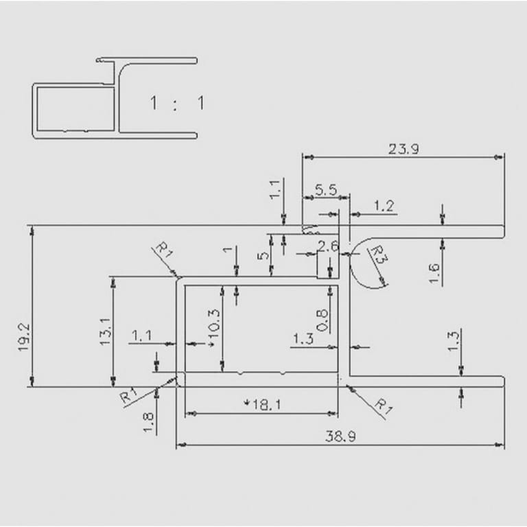 Dimensions: Core size (1:1 scale) includes 38.9mm (length), 19.2mm (height), and detailed features like R1/R3 curves, 1.1mm/1.2mm thicknesses (custom sizes available)